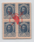 Российская Империя. Февральская революция. Надпечатка красная «Братство, Равенство, Свобода» на квартблоке 10 коп. Марки-деньги.Филателистическая заверка подлинности. **