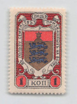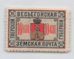 Российская Империя. Земская почта. Весьегонский уезд. 10 коп. Зеленая, красная и золотая. № 21 (Соловьев 40 $)Клей, наклейка 1895